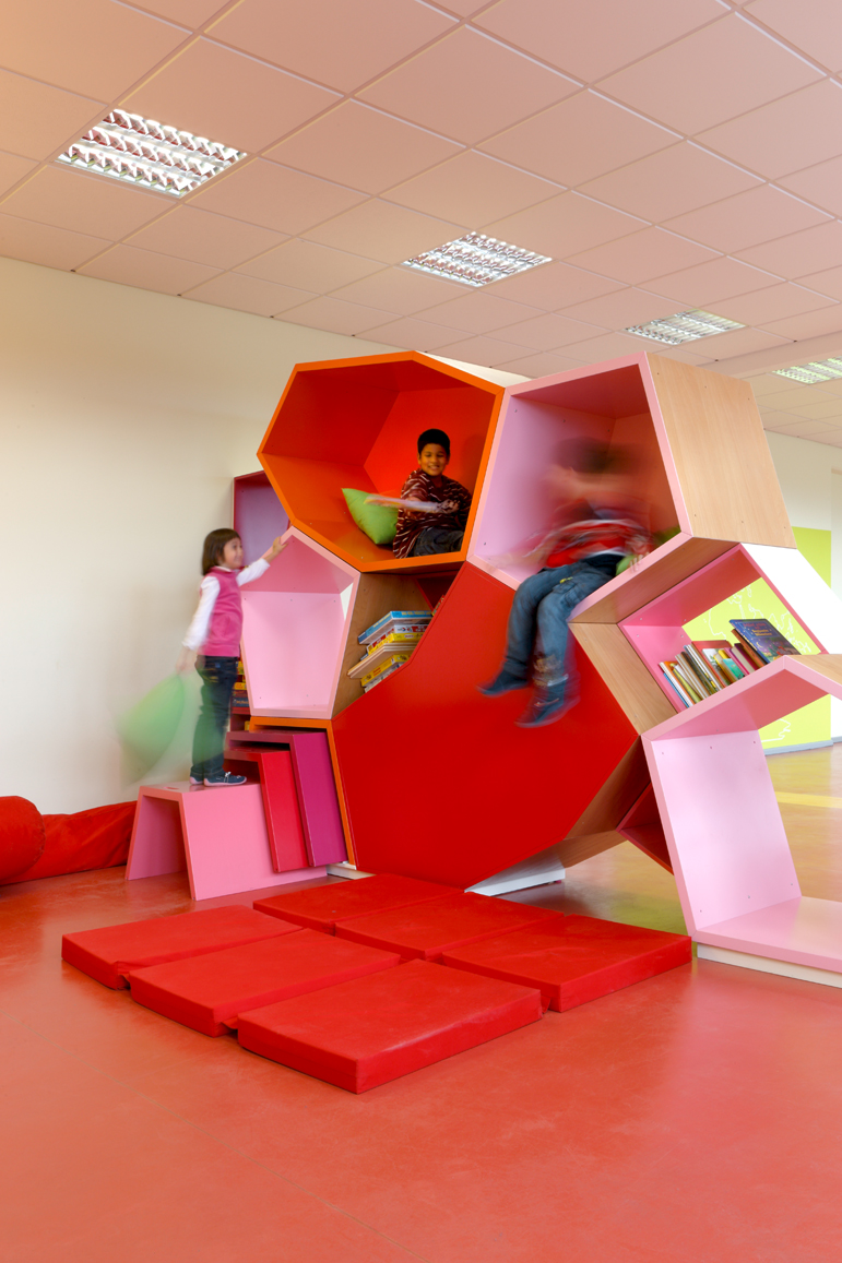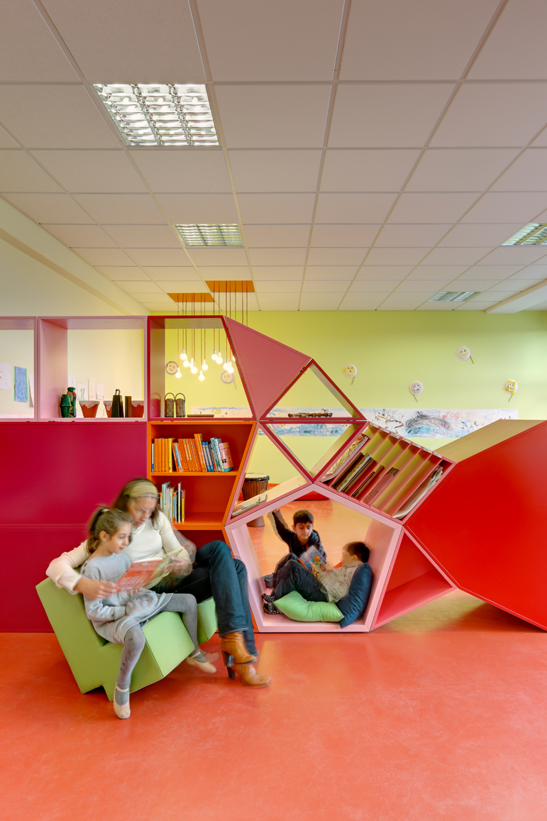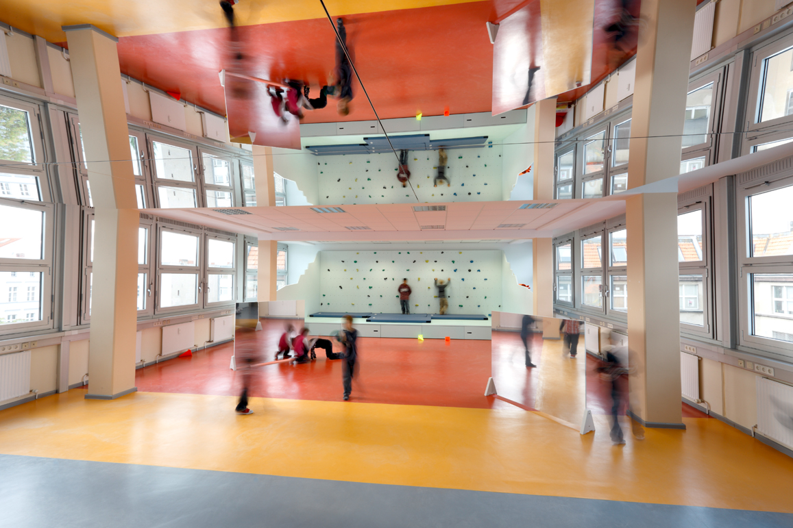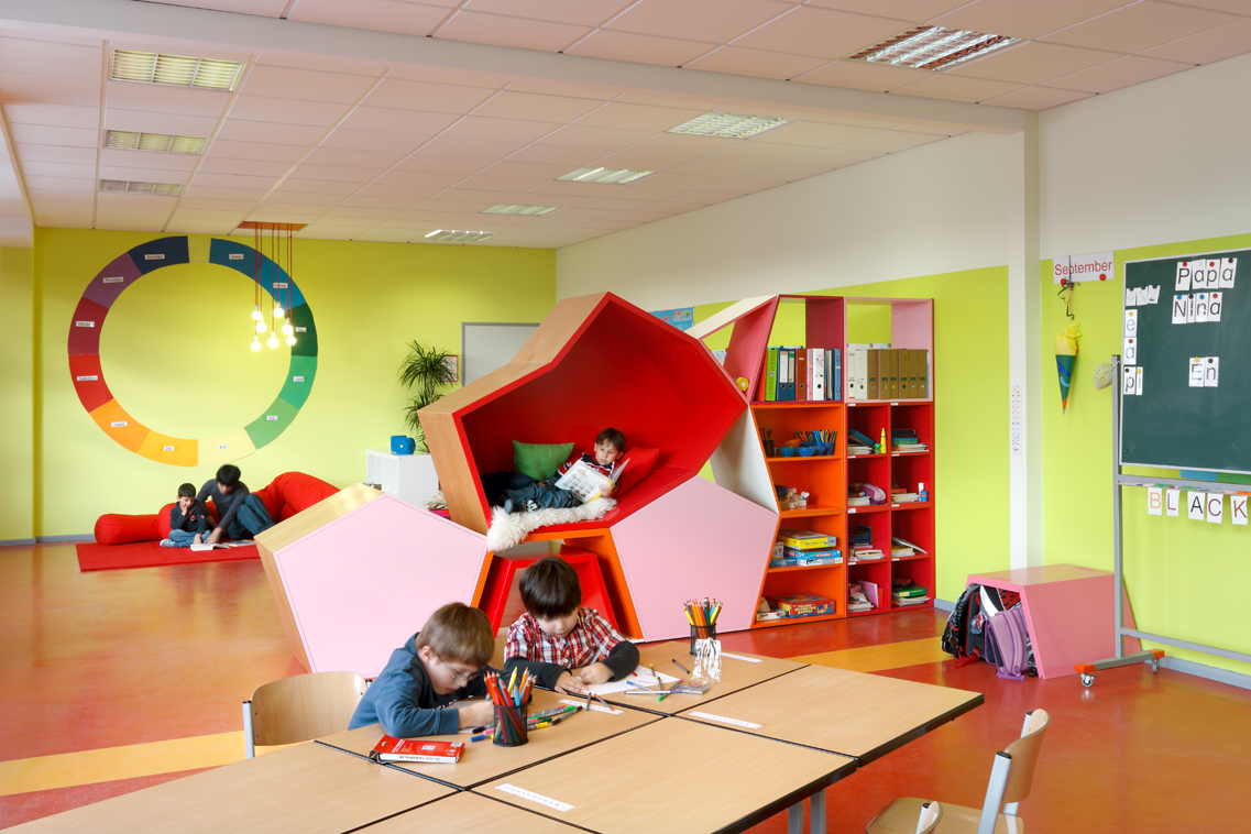 Die anonymen Wartebereiche und Arbeitsräume einer bestehenden Büroetage wurden in Lern-, Bewegung- und Aufenthaltsräume umgestaltet und auf die Bedürfnisse eines Schulbetriebs und die Kinder unterschiedlichster Altersstufen zugeschnitten. Frische Farben ersetzen das Beige und Grau der Verwaltungsraume. Verlässt man den Fahrstuhl, befindet man sich im Eingangsbereich der Schule, einem grünen Indobor-Garten voller Pflanzen und Kinderbildern. Zusammen mit dem angrenzendem Bewegungsraum und seinen großen Spiegelflächen stellt dieser Garten ein Pendant zum klassischen Schulhof dar. Die neue Schule des Familienservice soll mit den Schülern wachsen. Alle Einbauten haben modularen Charakter, lassen sich erweitern, verteilen und neu arrangieren. Sie geben den Räumen ihre Wirkung, Funktion und Programm. Kernstück des Entwurfs sind die modulrar Trennwände. Mit zunehmender Inbetriebnahme der Klassenräume wachsen sie in die Räume hinein, Sie fungieren dort als belegbare, bewohnbare, durchsetzbare Raum-/Funktionsteiler oder Spielobjekte und passen sich in ihrer Zusammensetzung der Nutzung der Räume an.