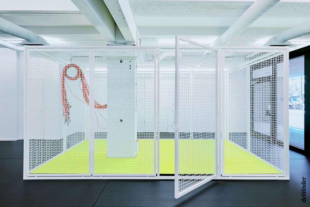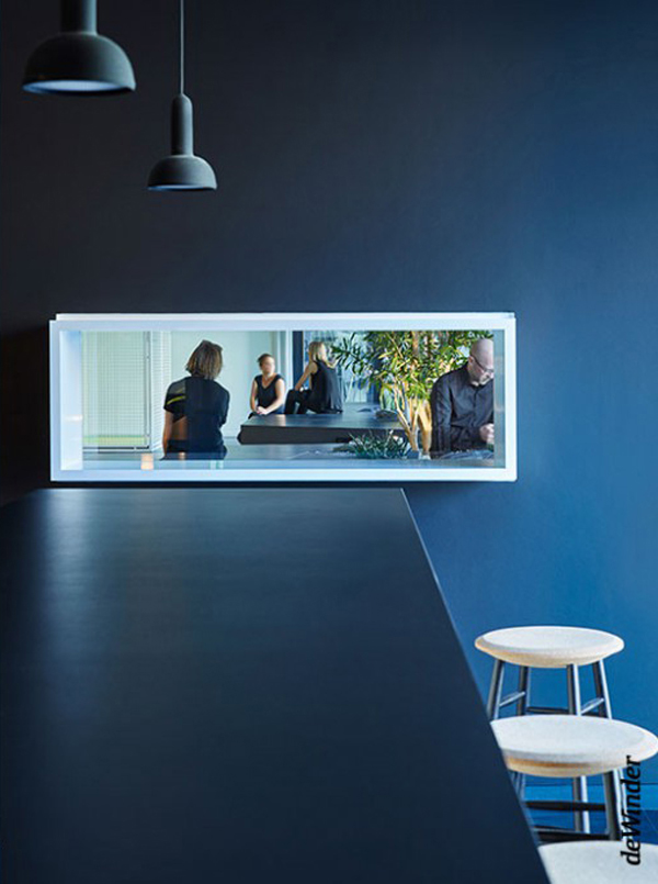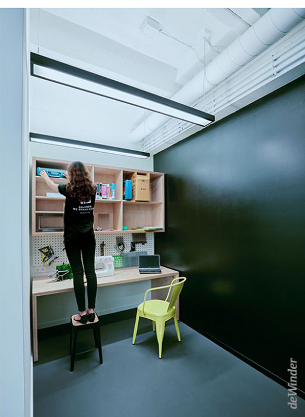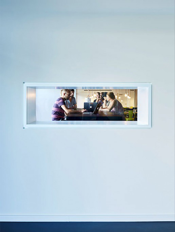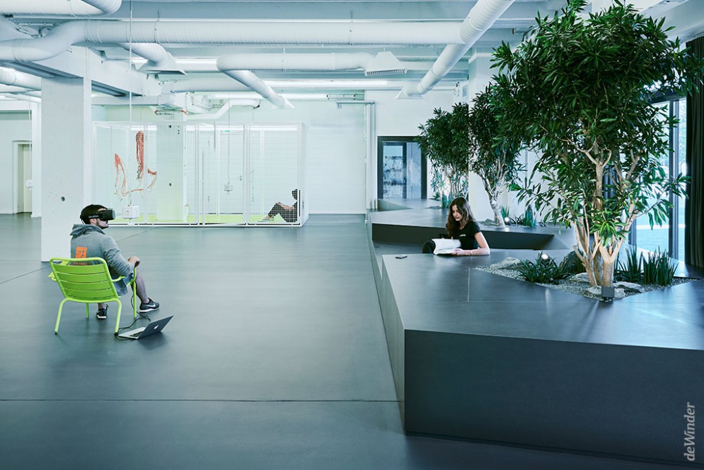 Das „Green Level“ - eine Art Landschaftsrelief - dient als Filter zwischen öffentlichem Raum und Innenraum und schützt vor direkten Einblicken der Passanten. Die elf Meter lange Sitzlandschaft mit Bäumen und Bodenbepflanzung bietet die Möglichkeit zum Relaxen und für Gespräche in grüner Umgebung.Eine frei im Raum stehende Rückwand verbirgt einen Stauraum für die mobile Bühne und Möblierung sowie eine voll ausgestattete Prototypen-Werkstatt mit Platz zum Arbeiten für zwei Personen.