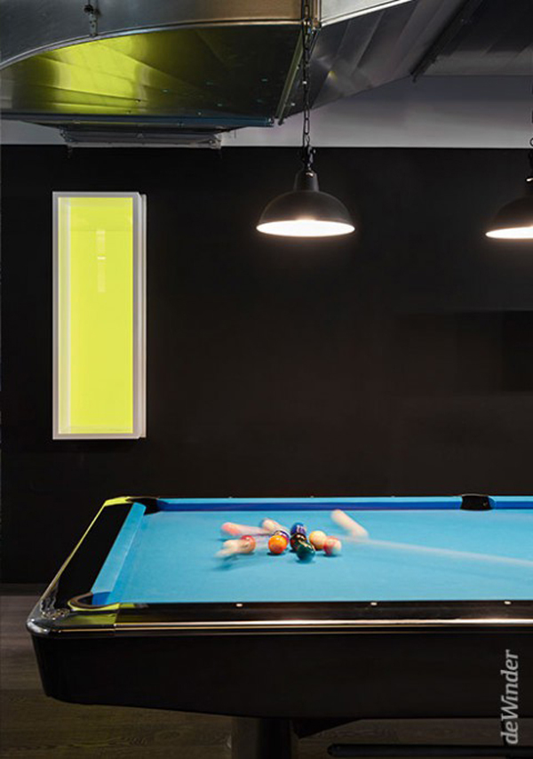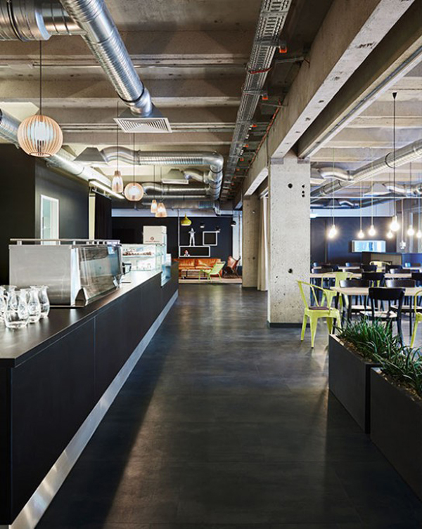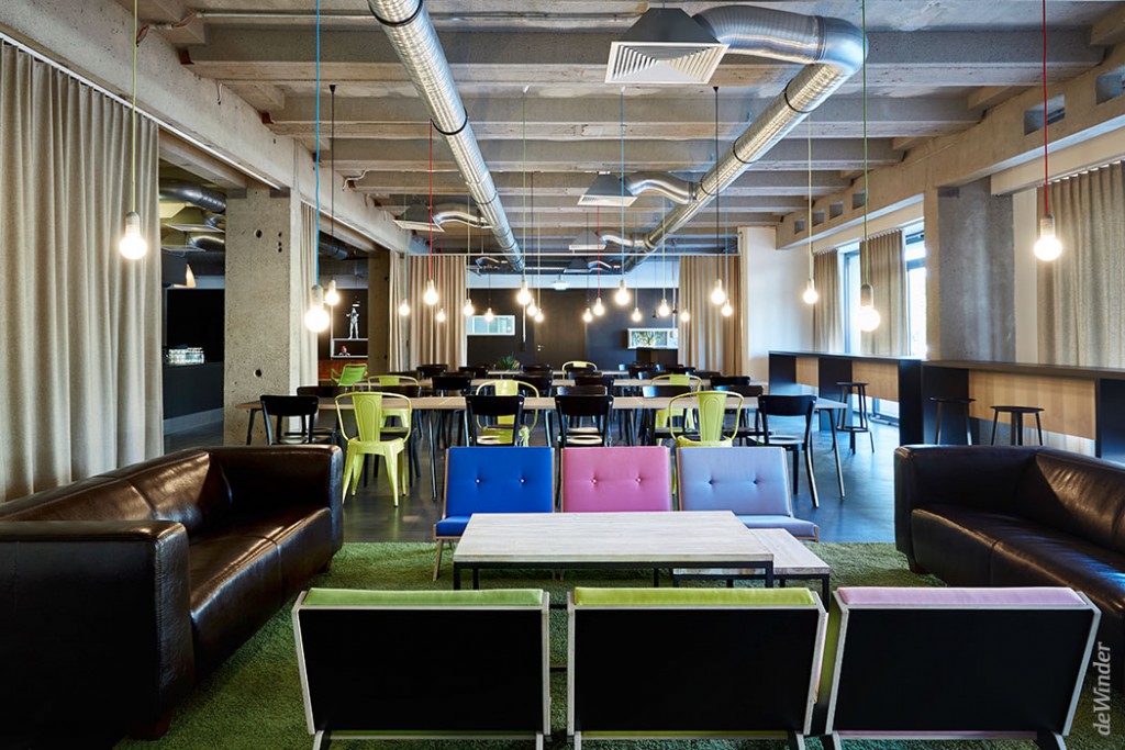 Der angrenzende Food Court steht den Mitarbeitern des Unternehmens als Cafeteria und Aufenthaltsraum zur Verfügung. Der Essbereich kann durch blickdichte Vorhänge räumlich abgetrennt werden. Fenster erlauben vereinzelte Durchblicke ins benachbarte Innovation Lab.