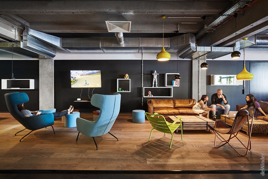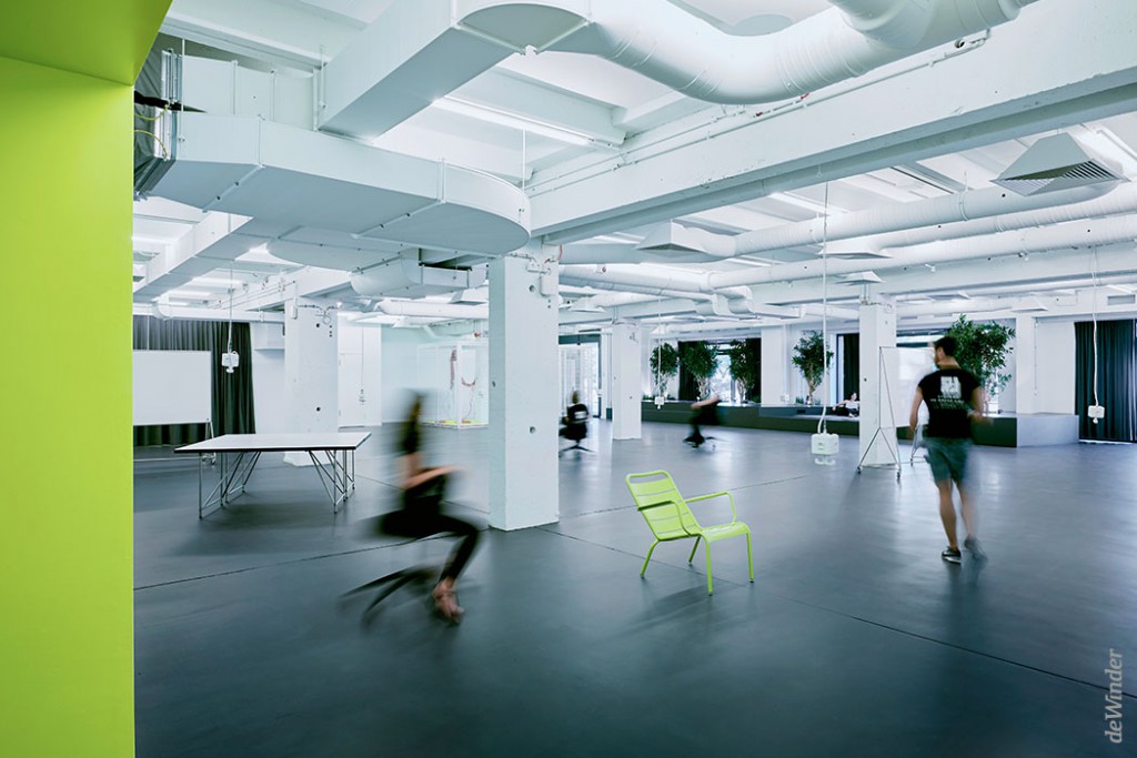 Der freie Raum lässt sich dank mobiler Möbelelemente flexibel nutzen. Die komplett weiß gestrichenen Wände und offenen Deckeninstallationen bilden einen neutralen Hintergrund für jede Form von digitaler Projektion.