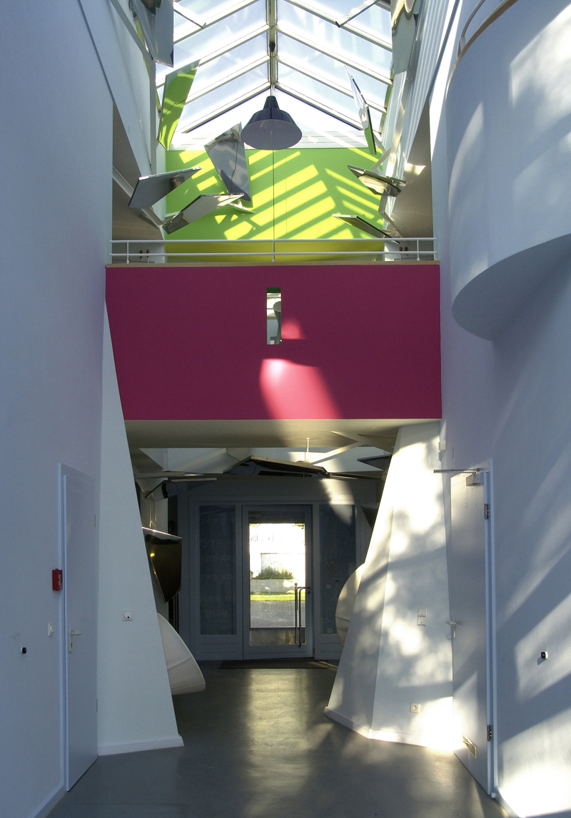 Die 1990 auf radialem Grundriss gebaute Kita sollte modernisiert, vor allem die dunklen Flure des zweigeschossigen Gebäudes aufgehellt und erlebnisreicher gestaltet werden. Mit den Umbaumaßnahmen definieren die Baupiloten die langen und dunklen Flure im Erdgeschoss der Kita als gruppenübergreifenden Gemeinschaftsbereich neu. Direkt am Eingang wird der Besucher in den 14 Sprachen der Kinder begrüßt und willkommen geheißen. Eine helle und freundliche Farbgestaltung wertet die Flurbereiche ebenso auf, wie die Lichtlenkelemente an der Decke, die je nach Tages- und Jahreszeit natürliches Licht aus dem Atrium in die Flure reflektieren. Neue schräge Gipskartonwände erzeugen ein Gefühl von Geborgenheit und bieten mit textilen, leuchtenden Sitzelementen unterschiedlichste Schutz- und Rückzugsmöglichkeiten für die Kinder an. Die sich ständig verändernde Licht- und Raumeindrücke regen die Phantasie der Kinder zur Kommunikation über ihre Sprachbarrieren hinaus an.